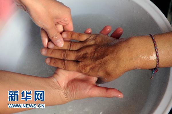 在为刘芳英刷牙的孟佩杰暗示母亲长大嘴巴(6月14日摄)。新华社记者 范敏达摄
